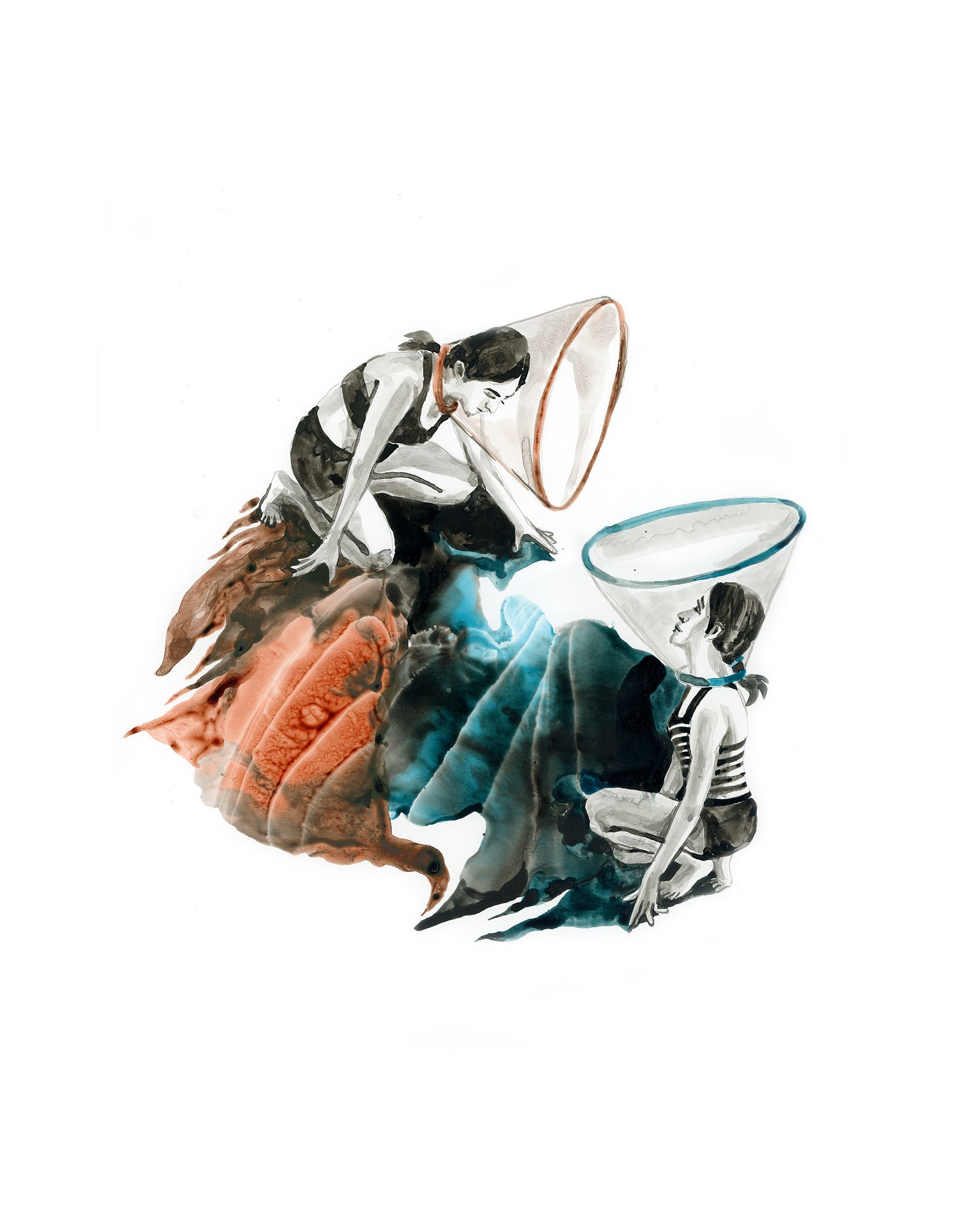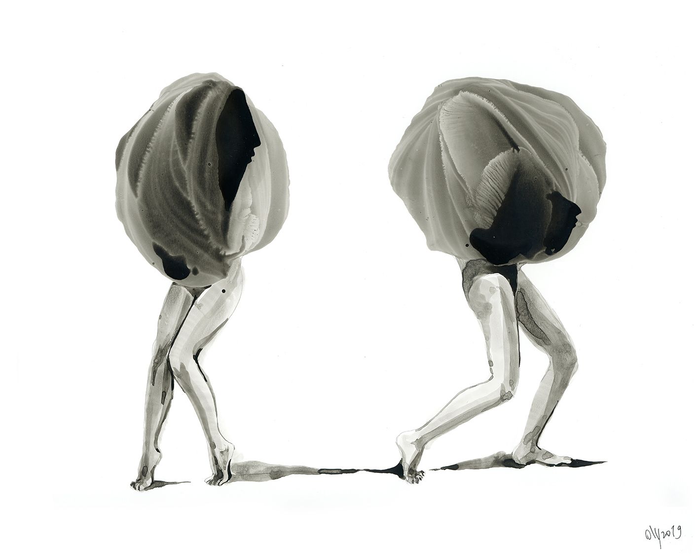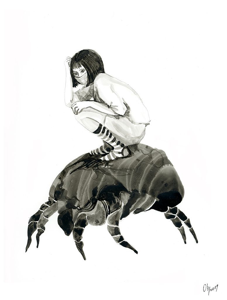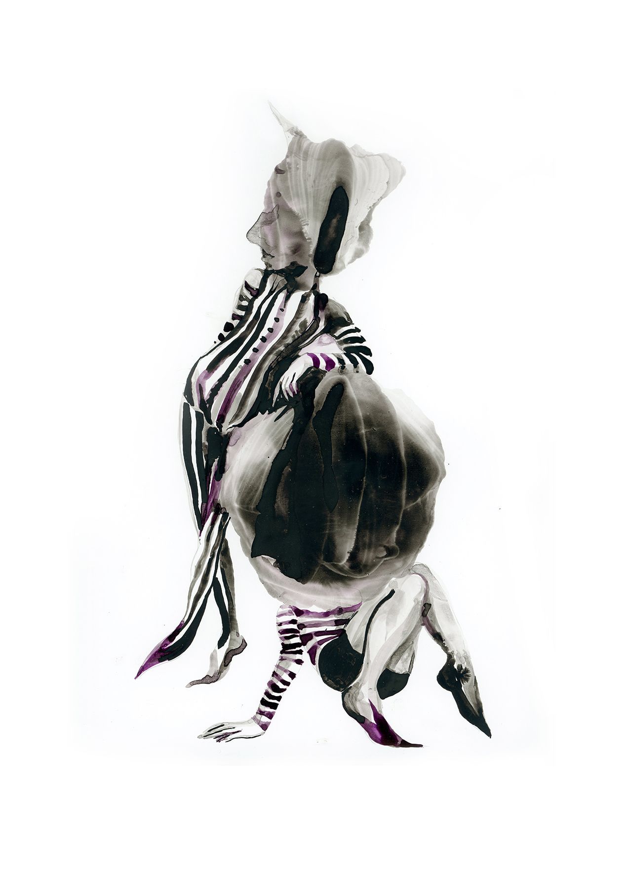 אני עובדת בטכניקת מונוטיפיה בשילוב רישום ידני. מונוטיפיה עבורי היא סוג של אינטראקציה עם היקום - הכתמים הראשוניים הינם מקריים, שלאט לאט מקבלים צורה, חיים משלהם ואינדיווידואליות. הם נועדו להעביר את תחושותיי ואת הסיפורים שאני שואפת לספר. לעיתים אני זו שמחליטה איך יונח הכתם על הנייר ומה יצא ממנו, ולפעמים הכתם הוא זה שמכתיב לי את הדמות שתיווצר ואת העלילה שתתפתח.